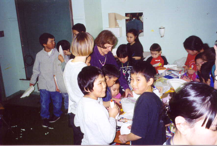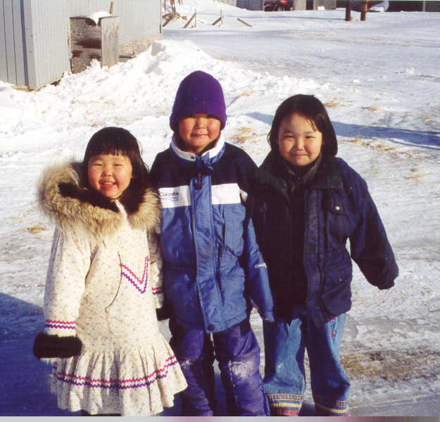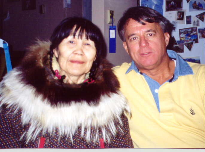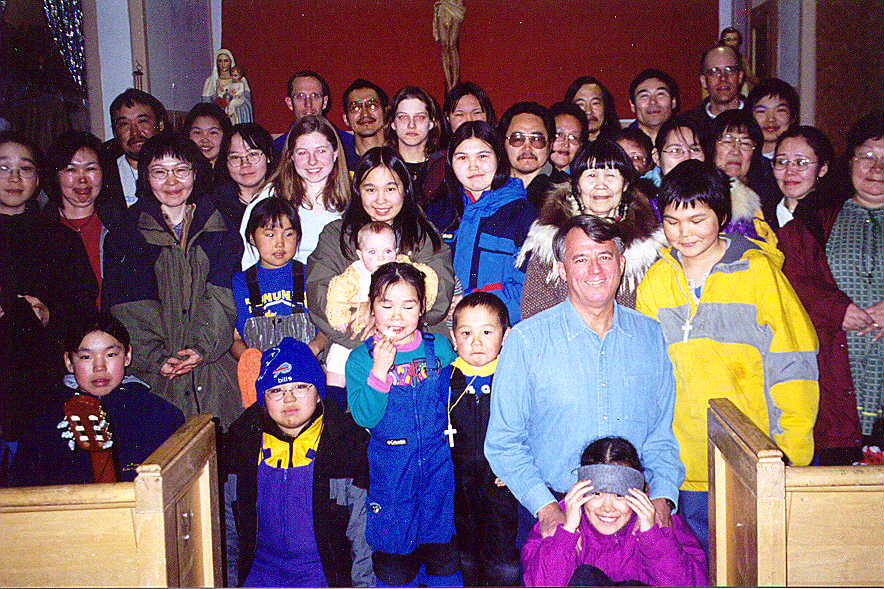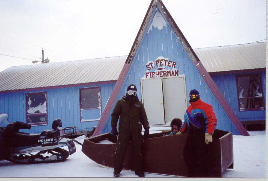 Left--Tom, John and Delores Lindeman arrive at St. Peter the Fisherman in Toksook for opening day of the mission. After landing on a small airstrip in Tununak, the final eight miles were completed by snowmobile and sled.